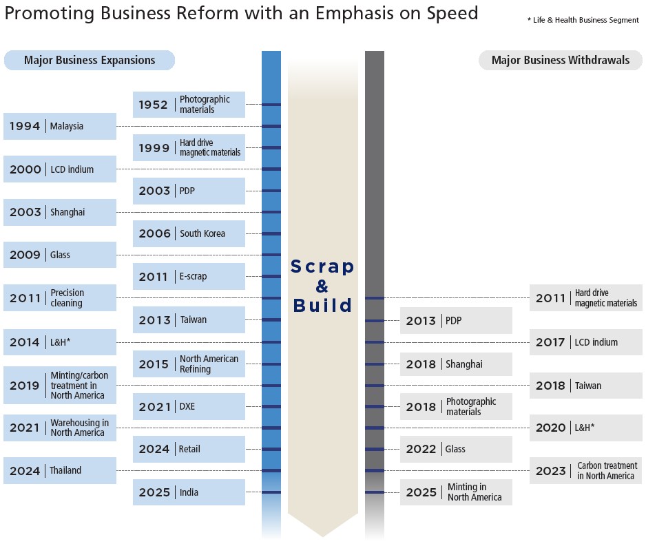 Since then, while managing to overcome various difficulties, we have taken on the challenge of creating new businesses and expanding into new areas. We have expanded the scope of our precious metals recycling to metal types beyond silver by collecting recyclable materials from various industrial sectors, such as dentistry, jewelry, electronics, and catalysts. In addition, we have acquired about 20 companies over the past 20 years, primarily in the Environmental Preservation Business. We have also obtained a North American refining company in a major acquisition, transforming our business portfolio. On the other hand, we did not hesitate to exit from businesses that we determined should not be continued from the perspectives of profitability, growth potential, and synergy. Our withdrawal from the photographic materials business and the Life & Health Business Segment, which were profitable at the time of withdrawal, are two such examples. Over the past 70 years since our founding, our Scrap and Build approach to business has allowed us to take on challenges.